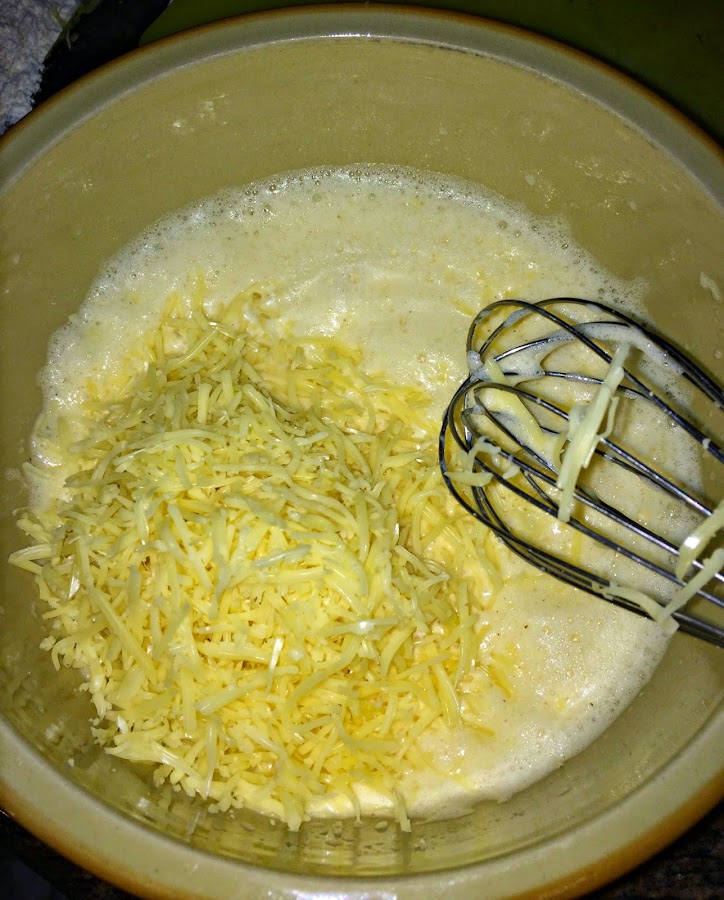 Una vez está bien batido, añadimos el queso rallado y lo mezclamos muy bien para que el queso se suelte.