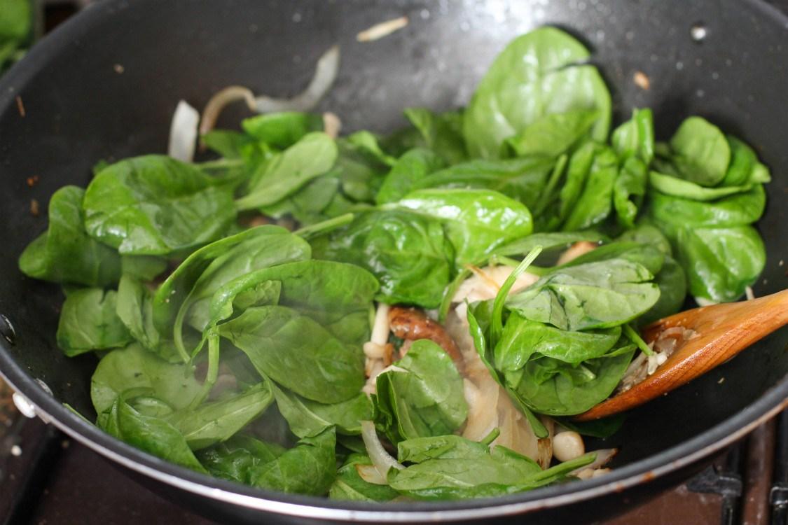 Usar un sartén o wok para saltear rápidamente la cebolla durante un par de minutos (o hasta que esté transparente). Agregamos las setas y cocinamos durante un par de minutos más. Aliñamos con una pizca de sal y pimienta y finalmente agregamos las hojas de espinaca. Cocinamos removiendo y mezclando todo por 1 minuto más.