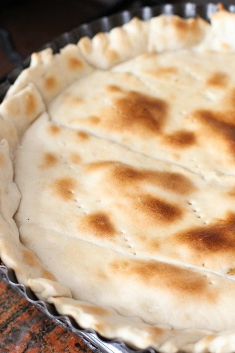 Enmantequillar un molde de tarta o quiche y colocar la masa cuidando de tapar por completo el molde. Usar las manos para cubrir bien todas las esquinas (si sobra masa puedes cortarla o aprovecharla y hacer doble borde). Pinchar suavemente la masa utilizando un tenedor (para que no se infle) y llevar al horno durante 5 minutos para precocinar (vigila para que no se queme).