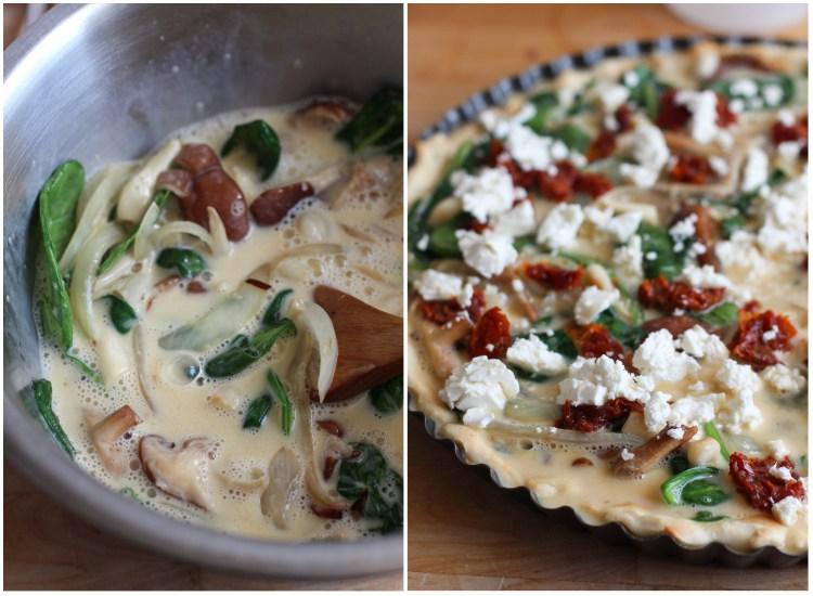 Verter el contenido del bowl sobre la masa precocinada, colocar por arriba queso feta o parmesano y tomate seco en trozos pequeños distribuidos de manera uniforme. Llevar al horno durante 15 a 20 minutos a 200ºC.