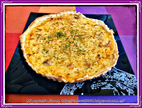 En una sartén ponemos aceite y echamos la cebolla cortada en juliana a pochar y dejamos hasta que dore, añadimos el bacón y el jamón y dejamos cocinar unos minutos para después ponerle la nata (crema de leche) y el perejil, mezclamos bien y dejamos cocinar unos minutos, pasado el tiempo retiramos y dejamos enfriar.