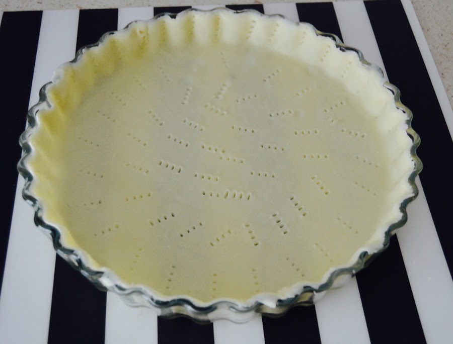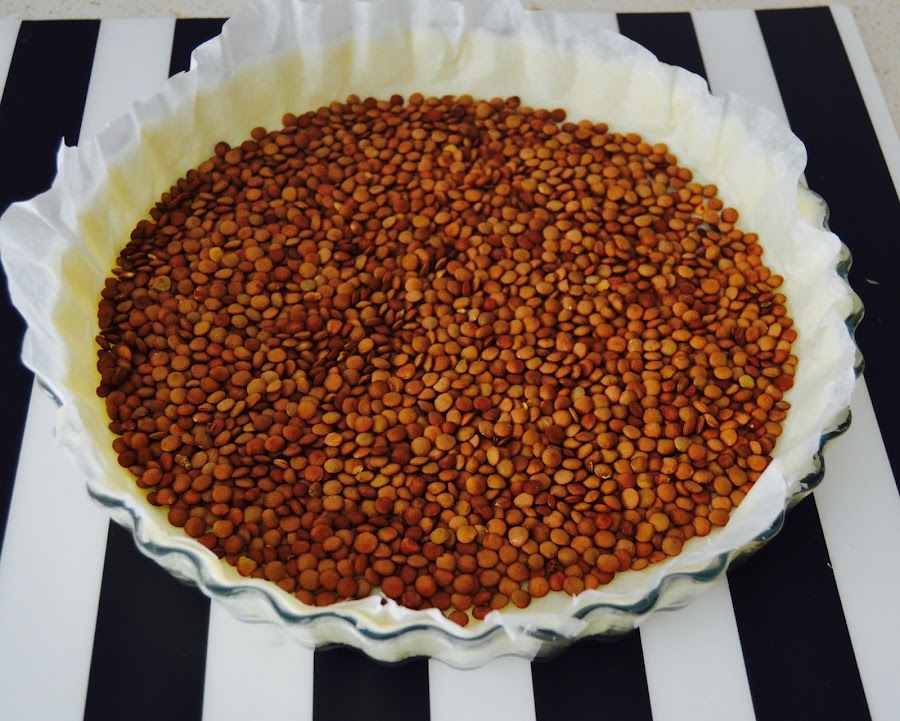 Segundo paso: Vamos a pincharla con un tenedor muy bien, para evitar que en el horno se infle. Tercer paso: Colocamos un papel manteca ( el mismo en el que viene envuelta la masa) y por encima ponemos alguna legumbre. Con esto, le estamos agregando mas peso, y tenemos la seguridad de que no va a subir. La llevamos a un horno precalentado a 200, por 8 minutos aprox, o hasta que veas que esta dura. Luego le sacas el papel y las legumbres y la llevas 3 minutos mas, para que se haga bien la base.