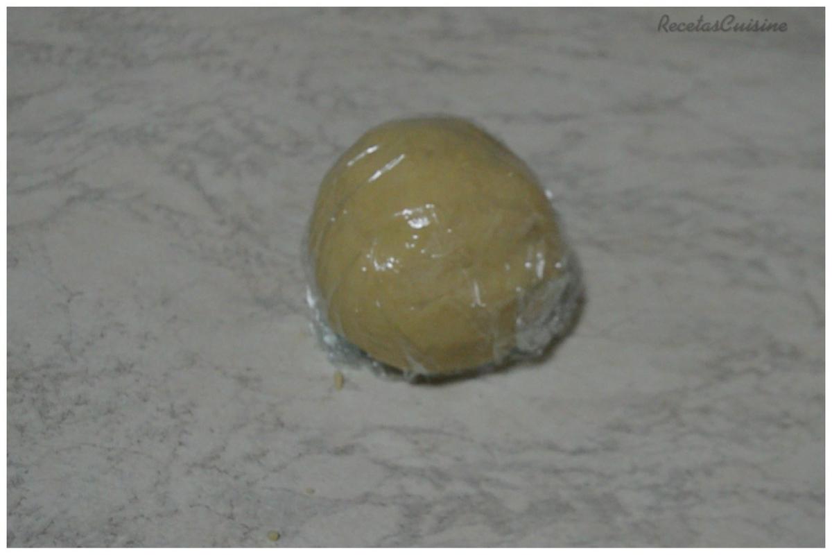 3. Hacemos una bola con la masa, la envolvemos en film y llevamos a la nevera unos 30 minutos para que coja consistencia y así, al estirarla no se nos rompa.