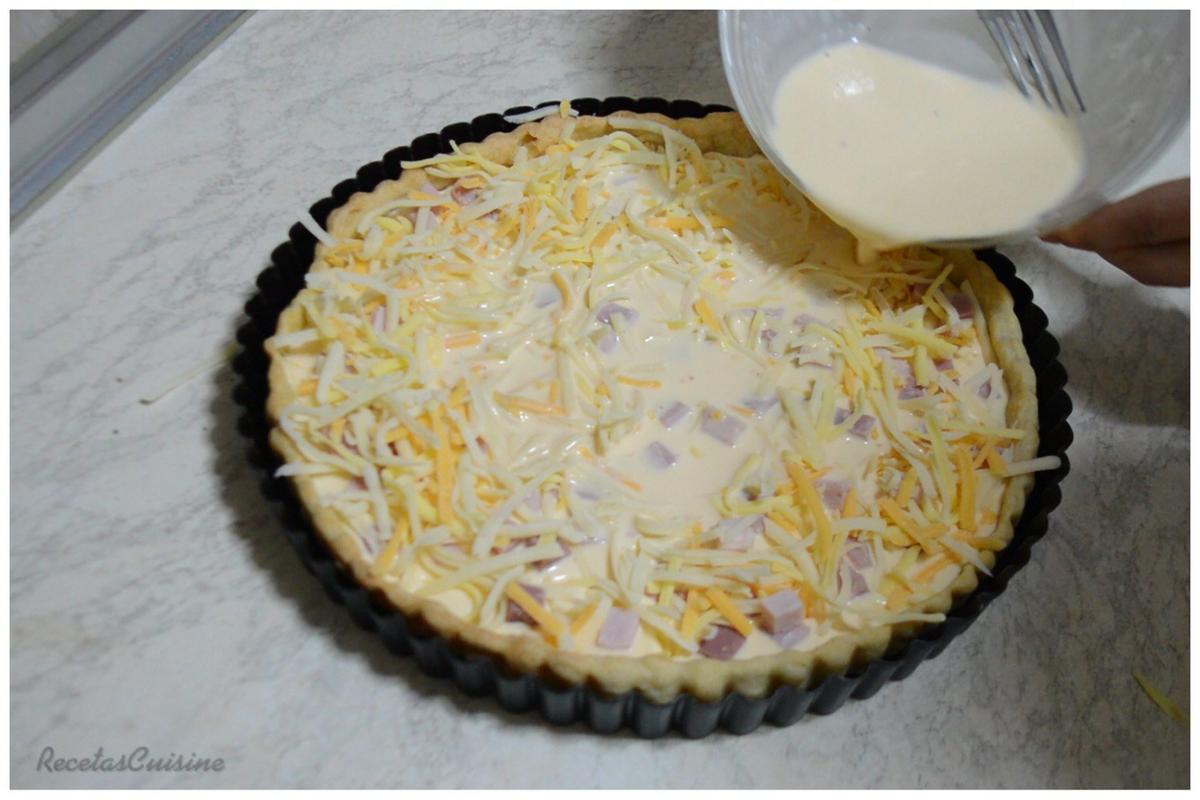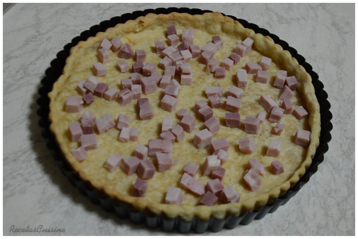 2. Repartimos el jamón en taquitos y el queso sobre la masa, regamos con la mezcla de huevos y nata (crema de leche) y horneamos a 180º durante 30 minutos aprox. o hasta que el queso dore. El tiempo, dependerá de nuestro tipo de horno.