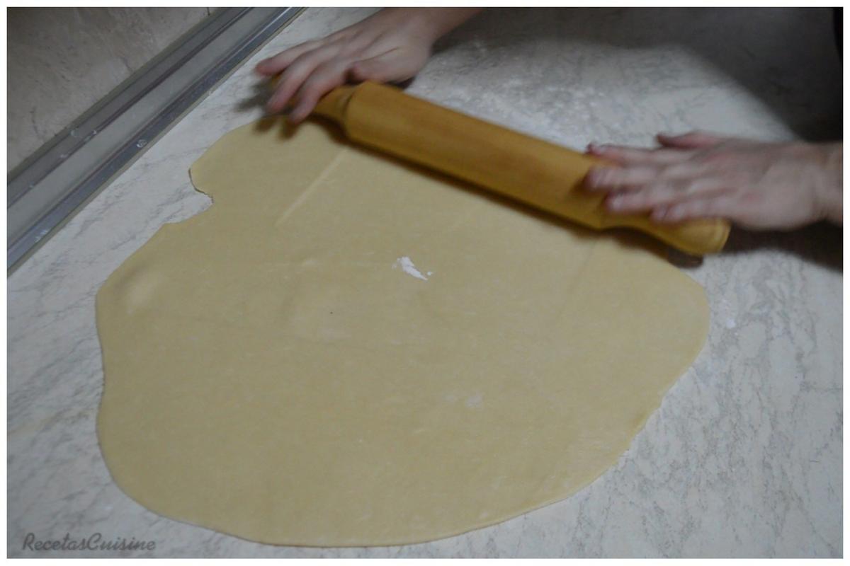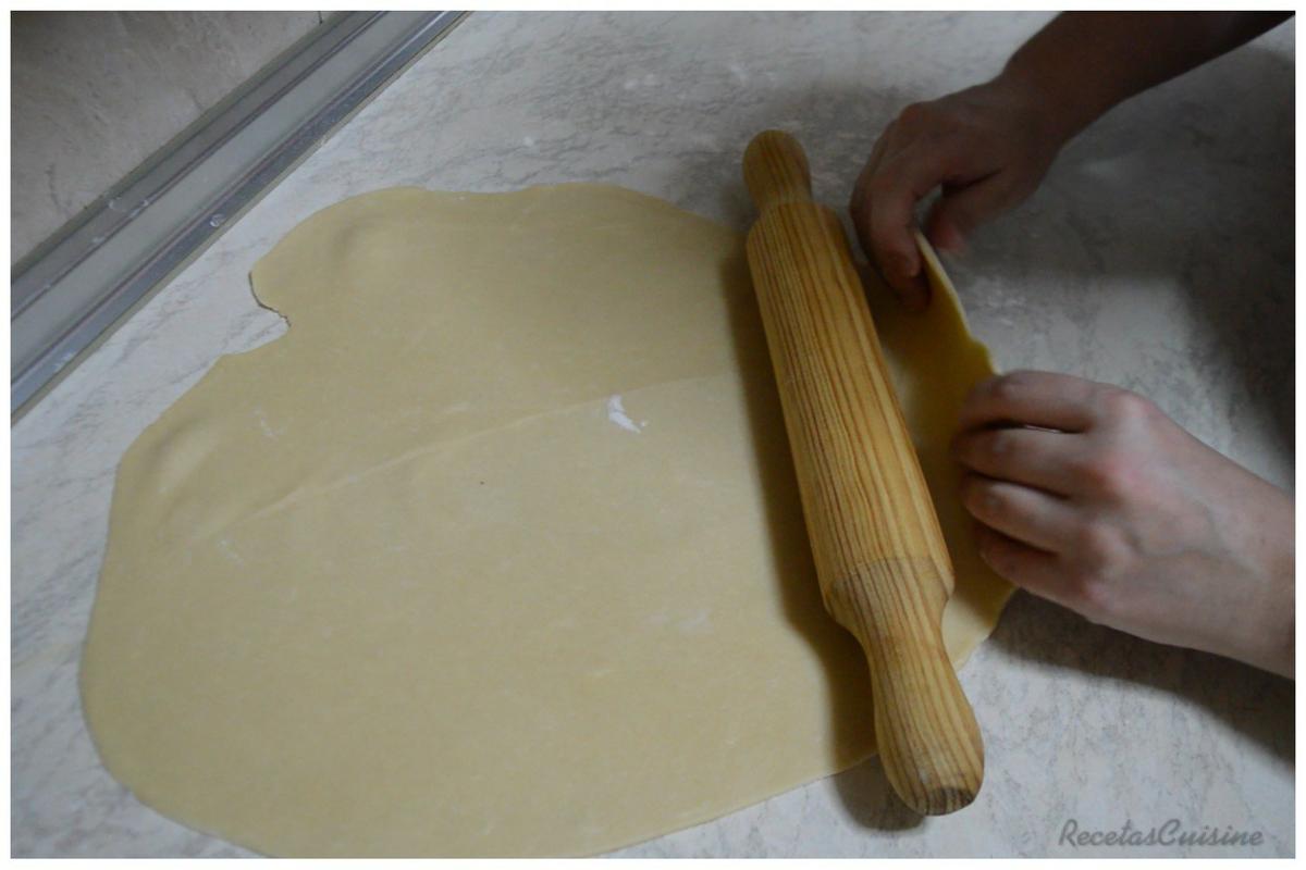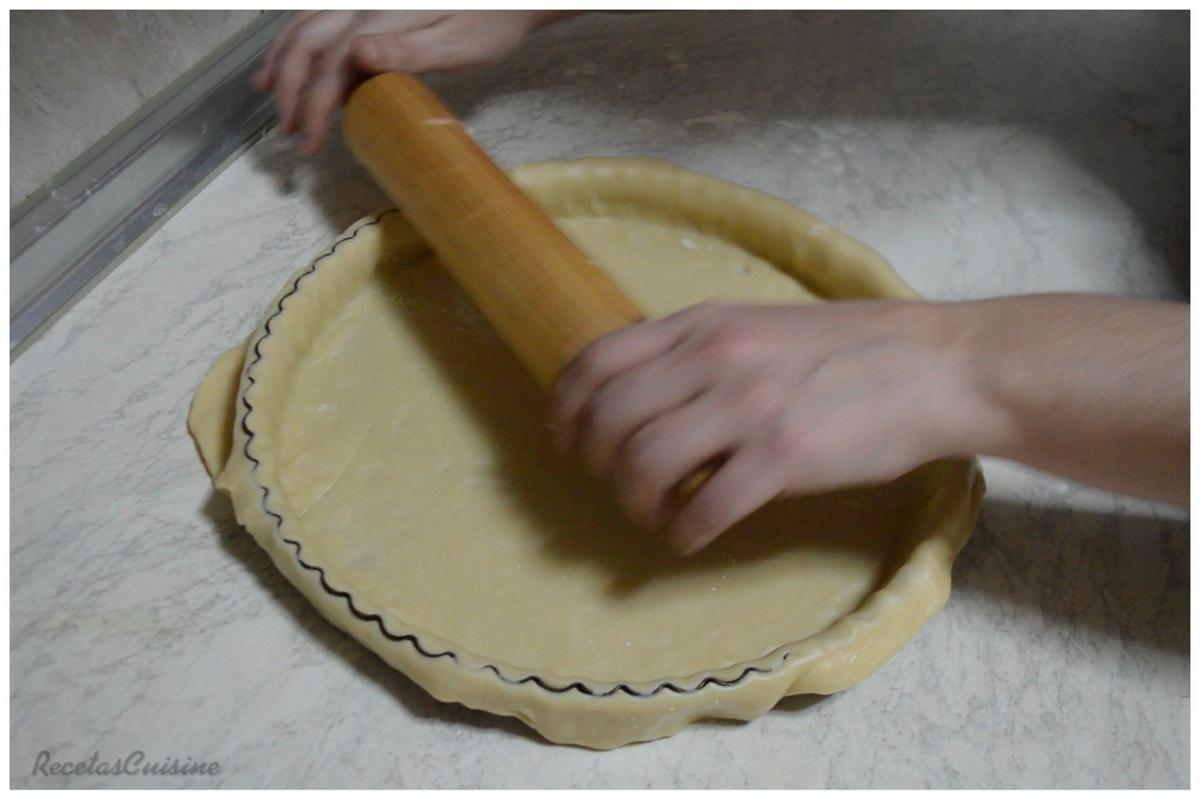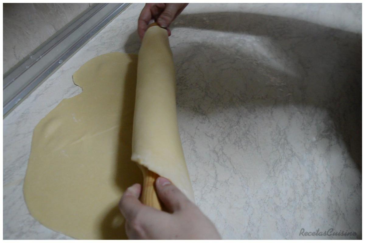 5. Para retirar la masa sobrante, podemos emplear un cuchillo; o también, podemos pasar el rodillo por los bordes cortando la masa con el filo del mismo si le tuviera.