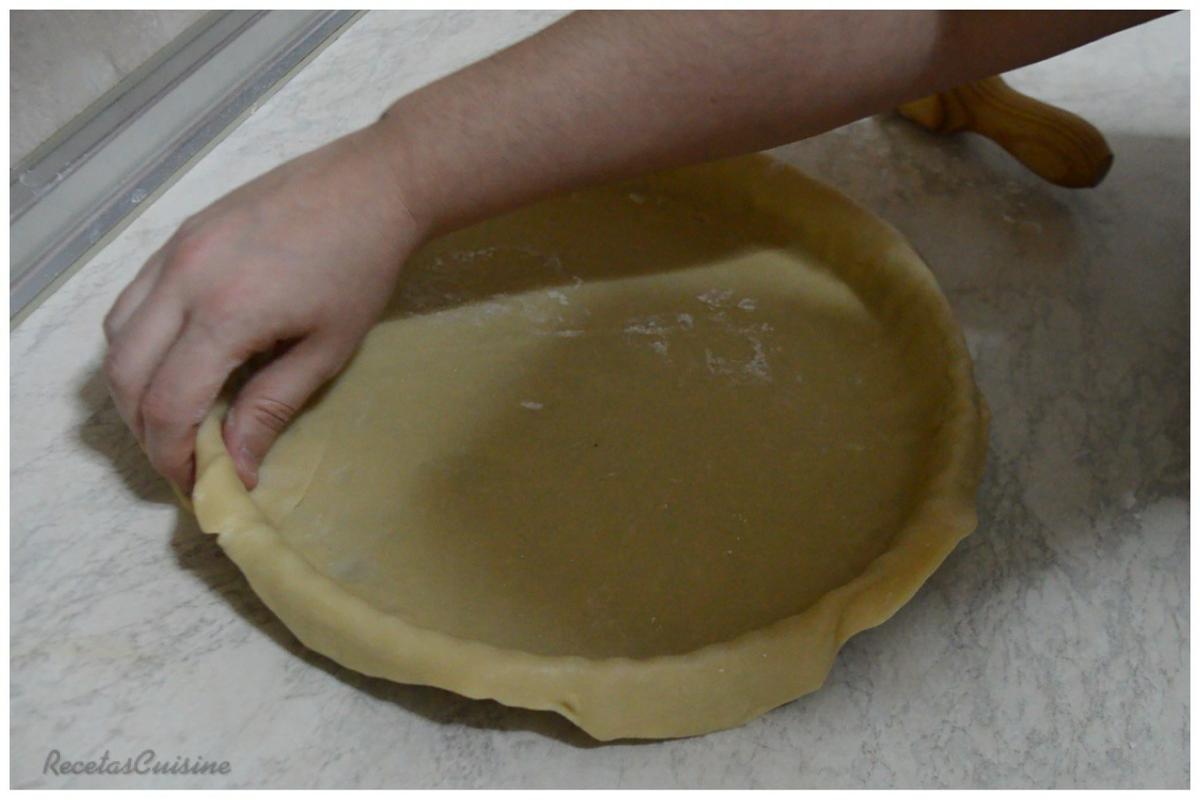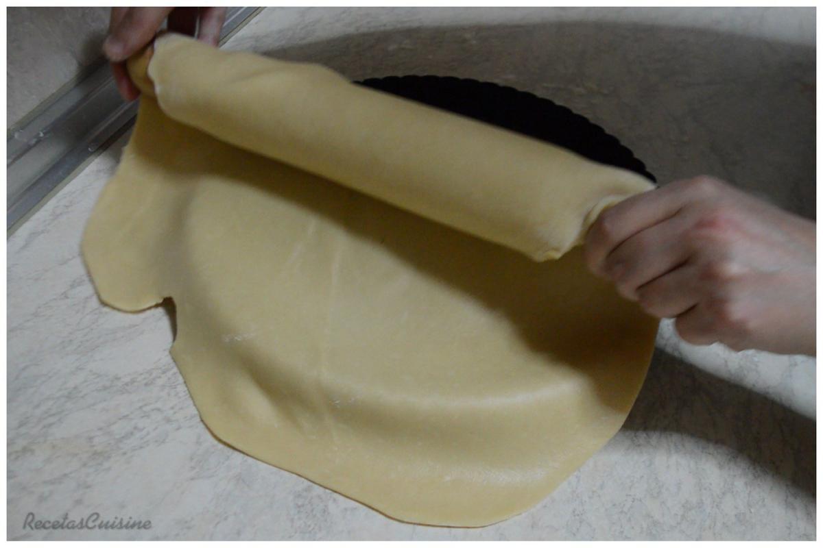 4. Sacamos la masa de la nevera, estiramos sobre una superficie ligeramente enharinada, y forramos con ella el molde donde la vayamos a hornear (para trasladarla al molde, podemos ayudarnos enrollándola con el rodillo). Presionamos suavemente con los dedos, ajustando la masa al molde.