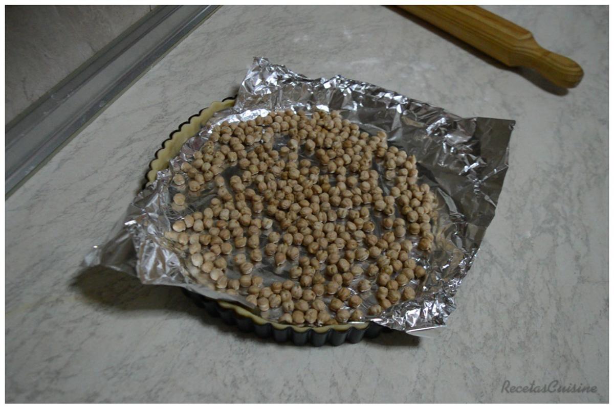 6. Con un tenedor, pinchamos toda la superficie de la base. Ponemos papel de plata sobre la masa, y cubrimos con legumbres secas. Debemos poner este peso para que la masa no suba al hornearla. Estas legumbres, una vez frías, las podemos guardar en un tarro para utilizarlas con este mismo fin en otras recetas similares.