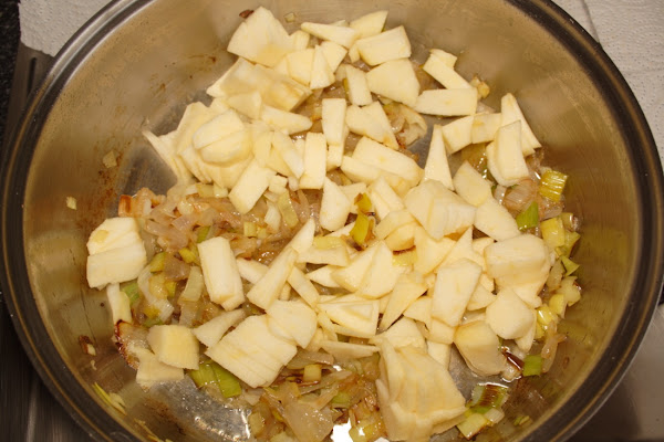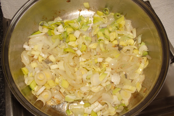 En una olla baja y ancha, pochamos la cebolla y cuando esté pochada, que no quemada, añadimos el puerro.