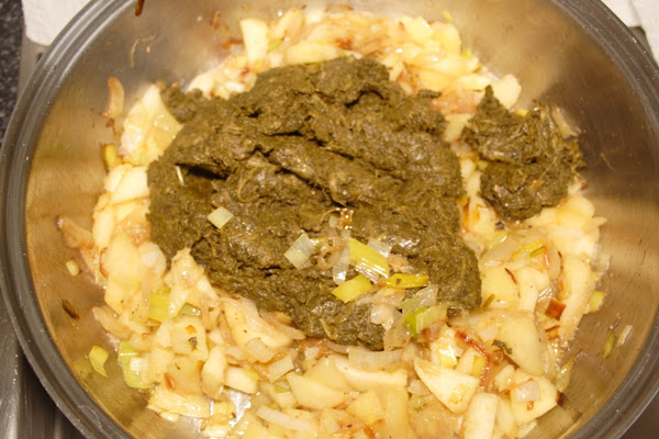Cuando estén blandos echamos la manzana pelada y picada en tacos no muy grandes.Dejamos que se ablande todo e incorporamos las espinacas bien escurridas.