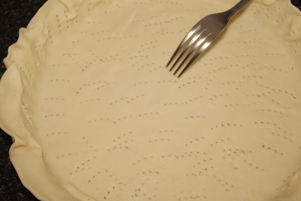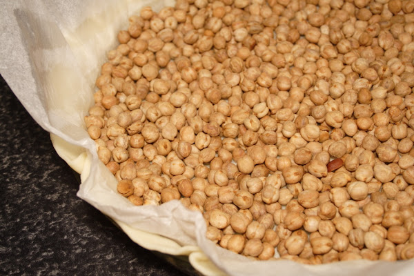 En el molde elegido, colocamos la masa pegándola bien a todos los bordes. La pinchamos bien con un tenedor por todas partes, incluido todo el borde, la cubrimos con papel que trae, le ponemos unos garbanzos por encima y la horneamos durante 15 minutos. Retiramos del horno, quitamos los garbanzos y el papel y reservamos.