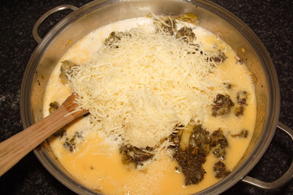 Removemos y dejamos que se integre bien todo, añadimos la morcilla desmigada, envolvemos unos minutos que se mezclen bien los sabores, retiramos del fuego e incorporamos los huevos batidos, la leche evaporada y el queso rallado, salpimentamos a gusto, espolvoreamos con perejil y removemos todo bien para mezclar.