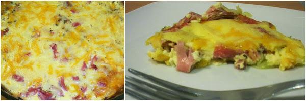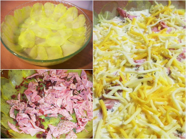 Sacamos el molde y pondremos encima de las patatas el jamón de york en trozos (tenía un poco de serrano en taquitos y también lo eché) después la mezcla de huevos y nata (crema de leche) y por último el queso rallado (yo utilicé de 4 quesos).