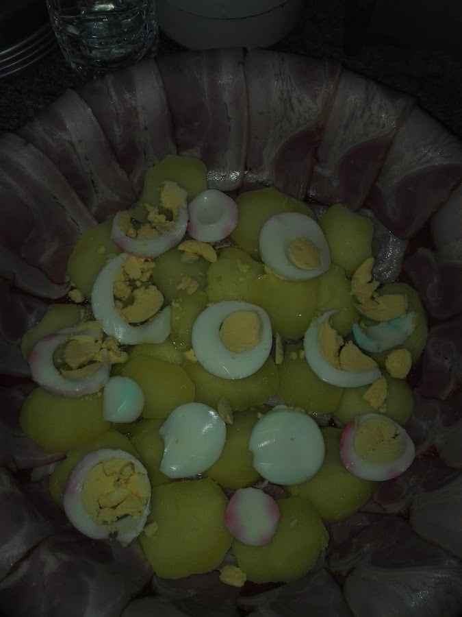 Se ponen las patatas con la piel a cocer y las dejamos unos 10 min. Tienen que estar cocidas a medias. Los huevos también las ponemos a cocer hasta que queden duros (unos 5 min.). Pelamos y dejamos enfriar.