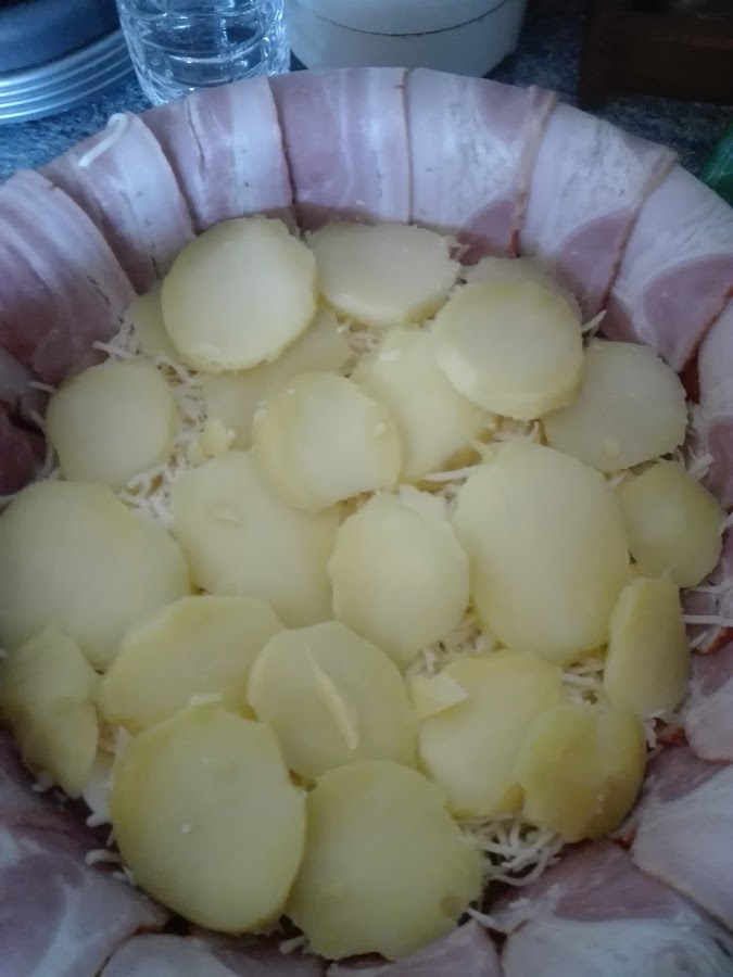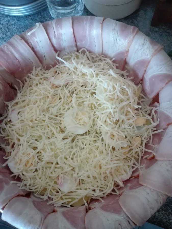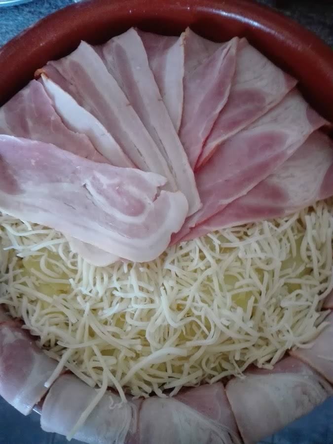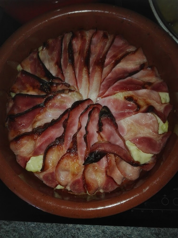 Cuando este llena, cubrimos todo con las lonchas de bacon que quedaron por fuera de la cazuela. Horneamos a 200° (con el horno precalentado previamente), hasta que veamos que el bacon esta bien doradito.