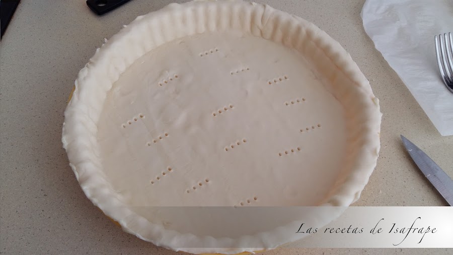 Precalentamos el horno a 190º C. Estiramos la masa sobre un molde especial para quiches, quitamos lo que sobresalga (en el caso de que sobre), y pinchamos con un tenedor el fondo para que no suba. Horneamos durante 8 minutos.