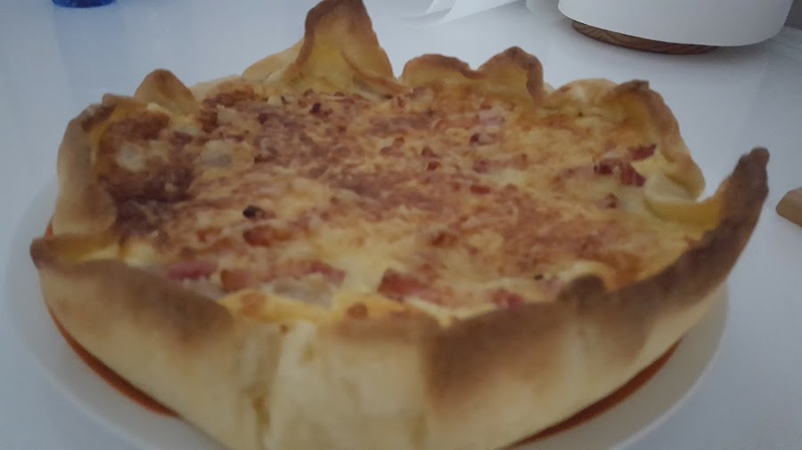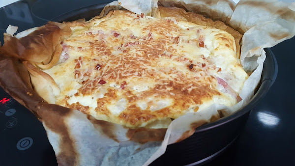 6.- Vertimos la mezcla en el molde con la lámina de masa quebrada y añadimos el pollo y el bacon. Mezclamos con una espátula y espolvoreamos con el queso rallado.