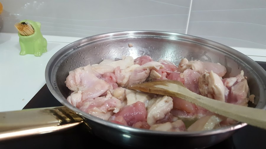 4.- Mientras ponemos a calentar el aceite en una sartén, en la que iremos rehogando los trozos de pollo que vamos cortando y el bacon. No lo freiremos mucho para que se acabe de hacer en el horno.