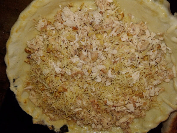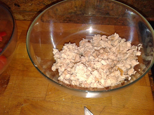 300 gr de pollo asado, 50 gr de nueces, 100 gr de queso gruyere rallado, un buen pellizco de nuez moscada.