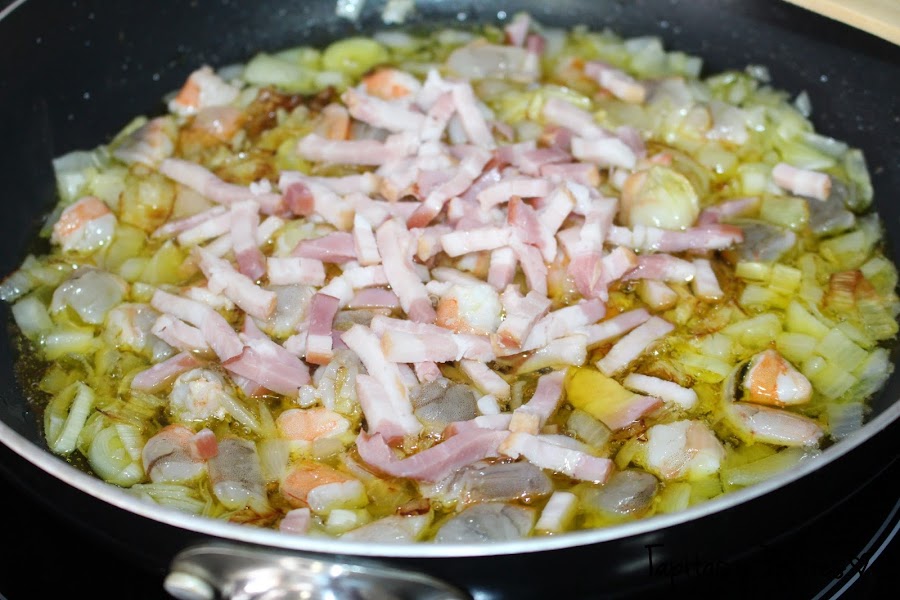 Cuando ya esté pochado, agregamos las gambas peladas y troceadas, damos unas vueltas e incorporamos el bacon. Dejams que se haga todo muy bien y apartamos del fuego. Quitamos el exceso de aceite y reservamos.