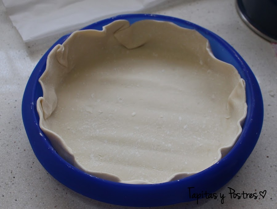 Desenrollamos el hojaldre y lo colocamos sobre un molde redondo. Lo pinchamos por todas partes con un tenedor.