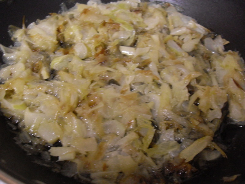 Mientras la masa reposa unos minutos, sofreír los puerros previamente limpios y cortados muy fino, solo la parte más blanca y tierna. Sacar de la sartén, escurrir y reservar.