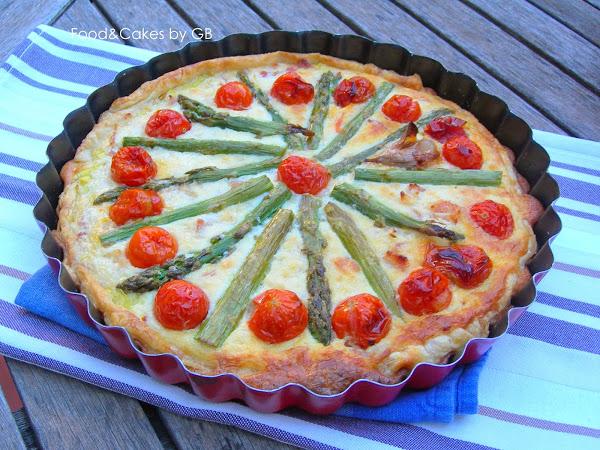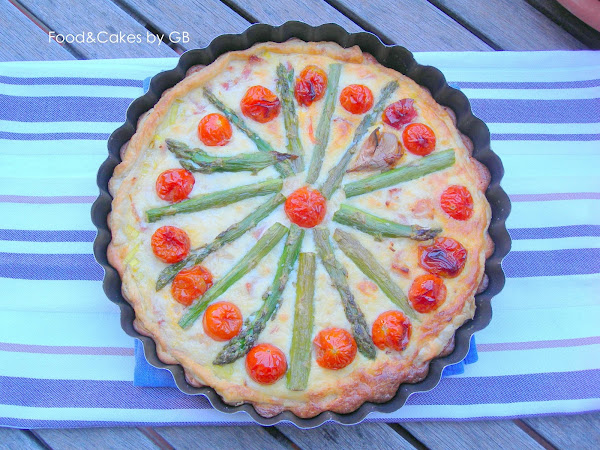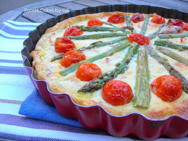 Decoramos encima con los espárragos y los tomates y horneamos unos 15 minutos más a 180ª.