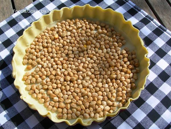 En la base de la masa ponemos un papel de horno cortado a la medida y que cubra todo el fondo. Encima le ponemos unos garbanzos crudos mirando de que queden bien repartidos por toda la base. Os dejo una foto para que se vea mejor: