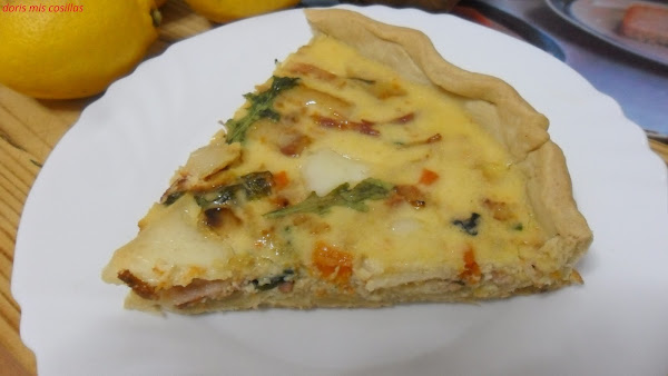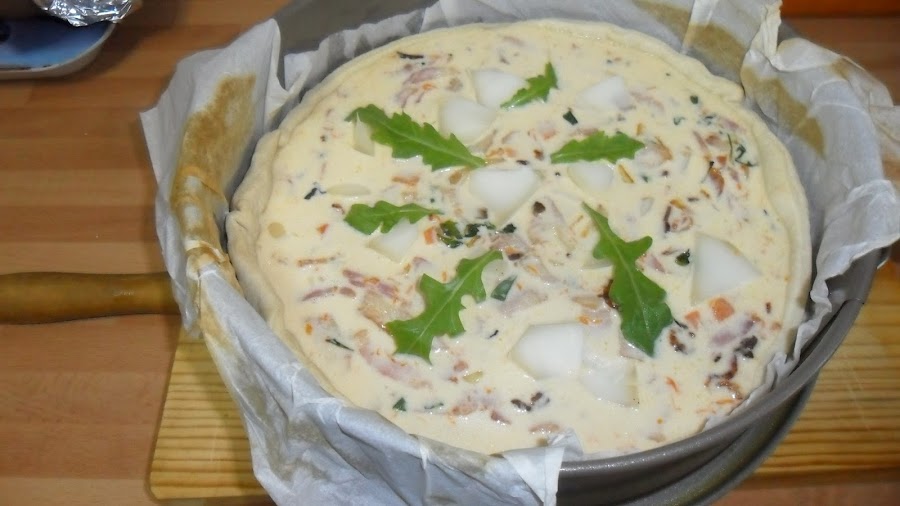 Yo la he adornado con unas rodajitas de queso tierno y unas hojas de rúcula y luego al horno.