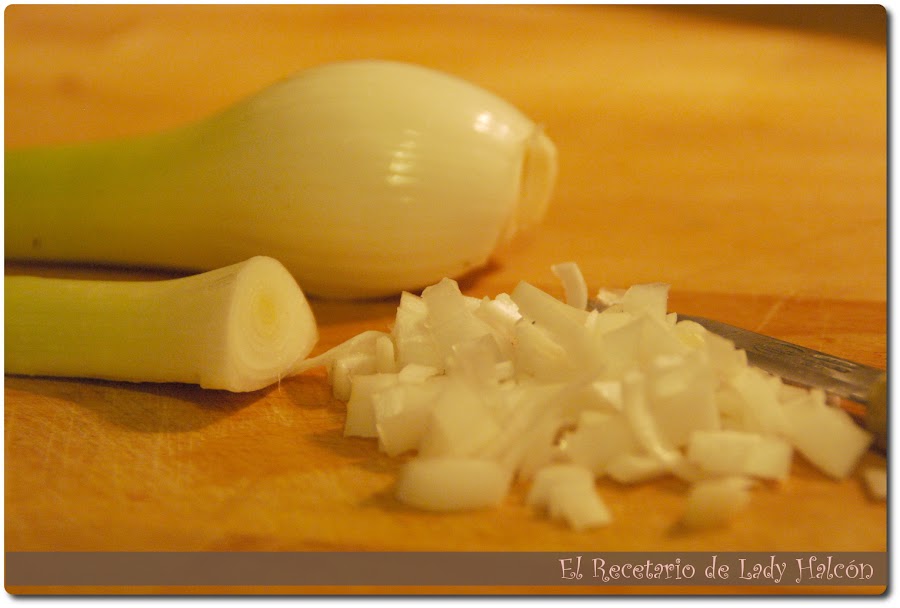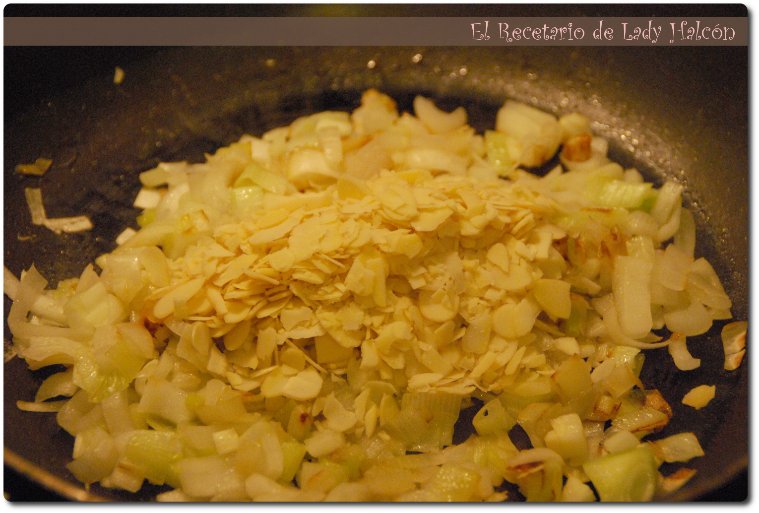 Pon en una sartén a fuego medio un poco de aceite y, cuando esté caliente, añade la cebolleta picada. Deja que se poche removiendo de vez en cuando. Cuando empiece a estar un poco dorada y transparente, añade las almendras y remueve un par de veces para que se mezclen con la cebolla.