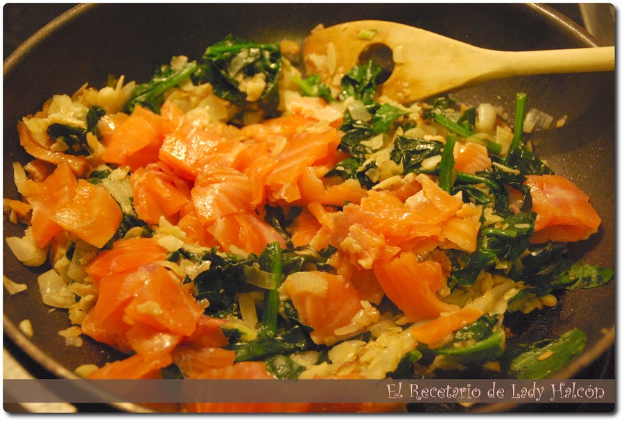 Por último, añade el salmón ahumado, dale un par de vueltas y retira la sartén del fuego. Yo no le añadí sal por que el salmón suele tener un sabor fuerte, pero corrígela si hiciera falta. Deja templar un poco el relleno.