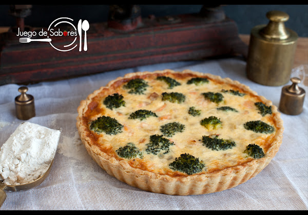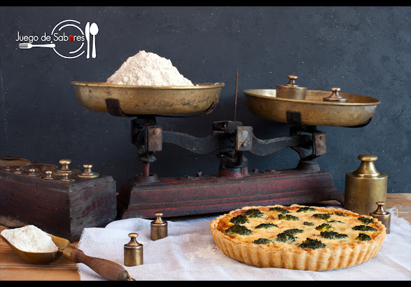 En cocina siempre me ha sorprendido la gente que hace las recetas con soltura, sin medir, pesar o calcular el tiempo de elaboración de los platos. Suelen ser personas que tienen mucha práctica, o que han aprendido de otras tan sólo fijándose y repitiendo lo que veían. Vamos, al estilo de nuestras abuelas que no habían visto un recetario de cocina ni por el forro. Son estas personas a quienes cuando se les pregunta cuánta sal pongo, qué cantidad de agua necesito para hacer esta sopa, o cuánto tiempo de horno requiere esta tarta te responden: Ah no sé, yo lo hago a ojo. Prueba de hacerlo a tu manera. Pues yo no tengo esa seguridad y prefiero medir, pesar y calcularlo todo. Por esta razón saqué del desván una vieja báscula para pesar la harina y demás ingredientes de esta quiche de brócoli y salmón que hoy os proponemos.