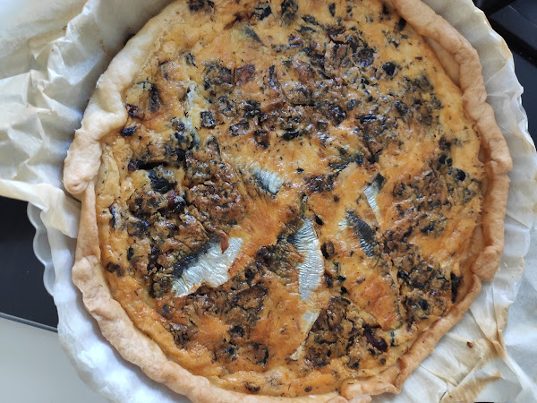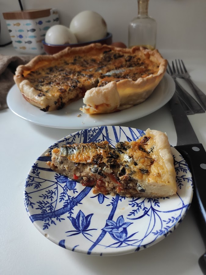 En un bol mezclamos los 4 huevos con la nata (crema de leche). Añadimos sal y pimienta. Ponemos el pimiento y la cebolla pochados en la tarta que tenemos reservada. Añadimos el picadillo de aceitunas, cubrimos con la mezcla de huevos y nata (crema de leche) y, finalmente, colocamos los filetes de sardina con la piel hacia arriba.