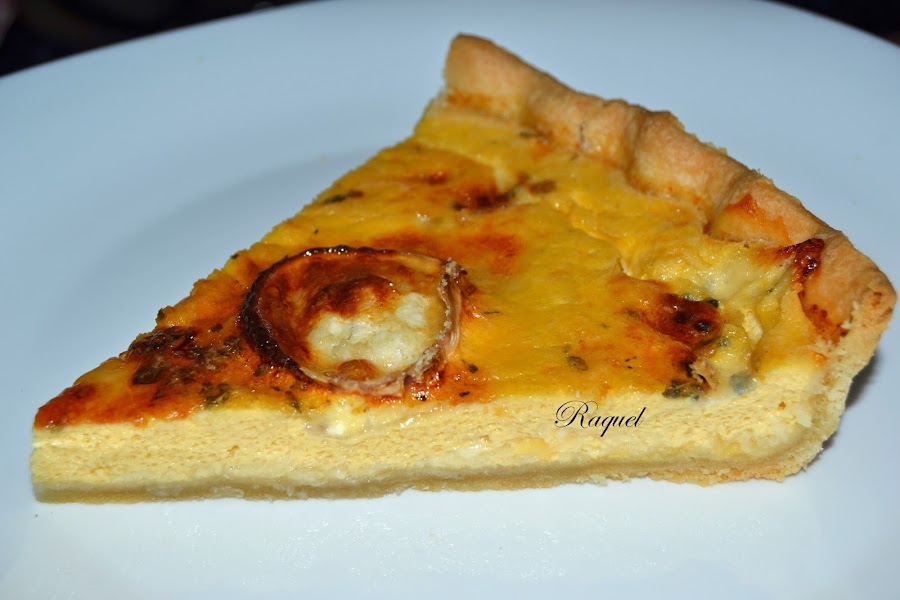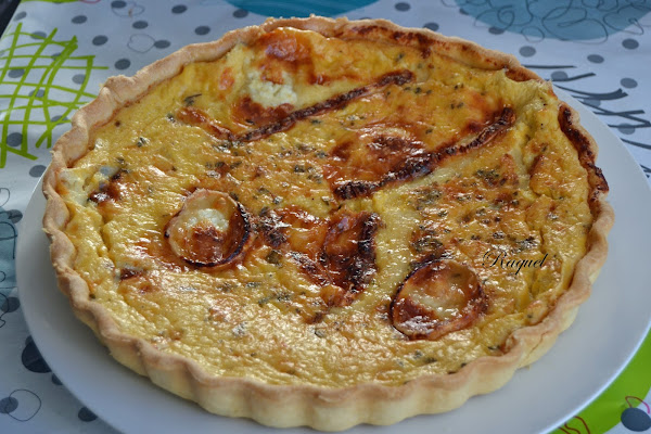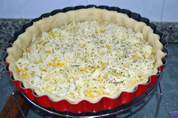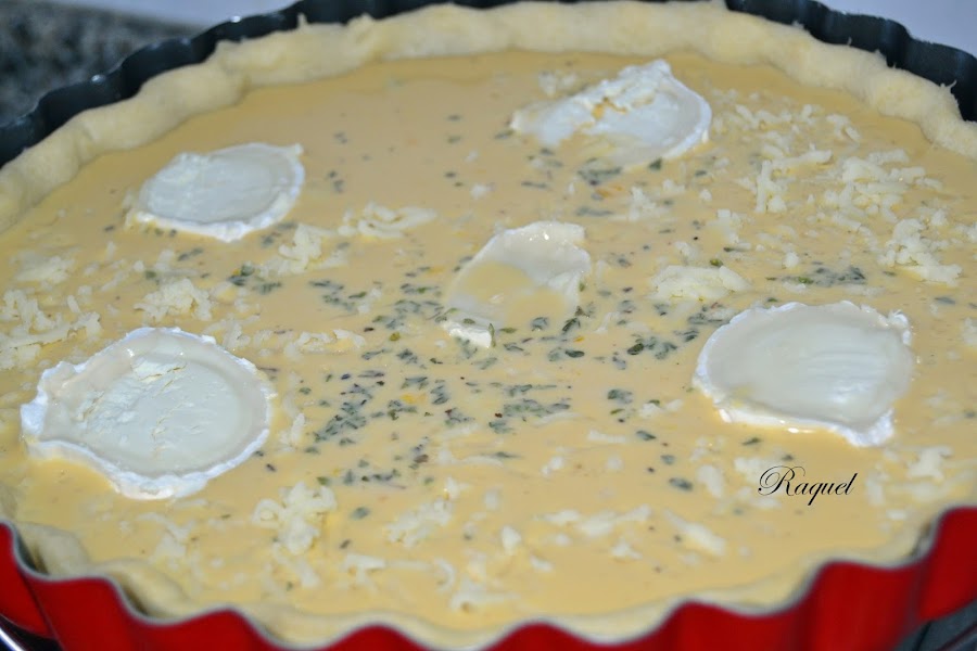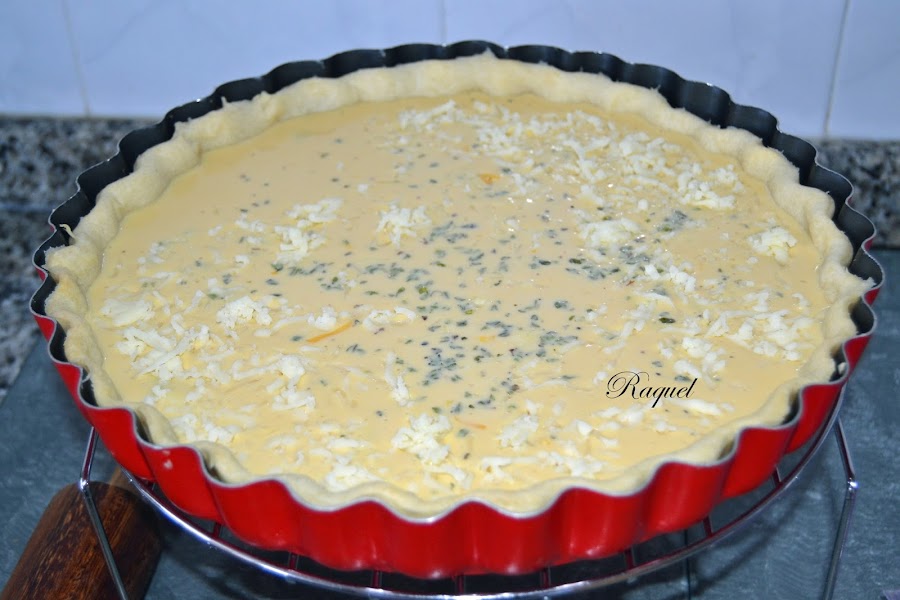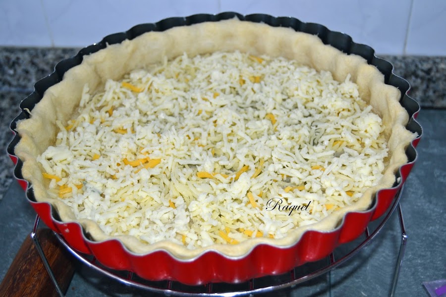 Repartimos la mezcla de quesos, el roquefort a trozos pequeños sobre la quiche.
