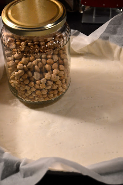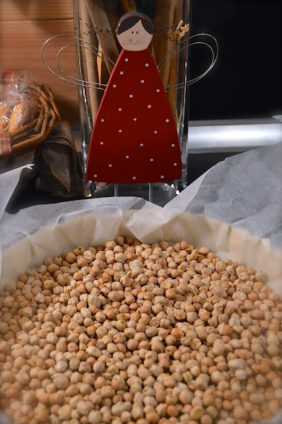 Precocinaremos la base de hojaldre, colocándola sobre un molde redondo y practicando unos agujeros con un tenedor. La cubriremos con un papel de horno y añadiremos unos garbanzos por encima. Finalmente hornearemos durante 15 min a 180ºC.