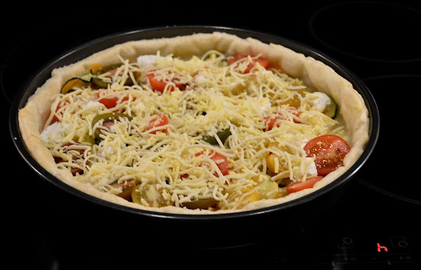 Extenderemos en el fondo de la masa precocinada el salteado de verduras, cubriremos con tomates cherry cortados por la mitad. Finalmente, añadiremos el parmesano rallado y unos pellizcos de queso de cabra...