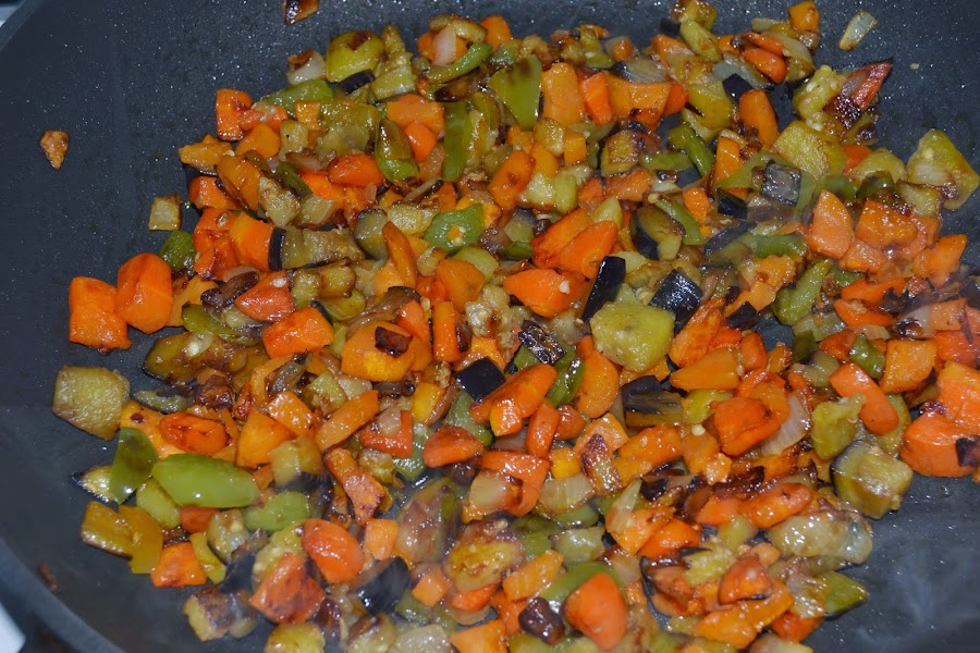 Pelamos y cortamos la cebolla en trozos pequeños, la freímos, mientras cortamos el pimiento, la berenjena, la zanahoria y el boniato lo añadimos a la sartén y echamos sal y pimienta, vamos removiendo hasta que estén.