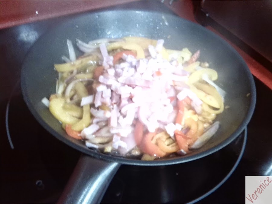 Se pela el ajo, le limpian y cortan los pimientos y la cebolla a tiritas finas, se lavan y cortan los cherrys por la mitad poniéndolo todo al fuego en una sartén al fuego fuerte sofriéndolo hasta estar doradito
