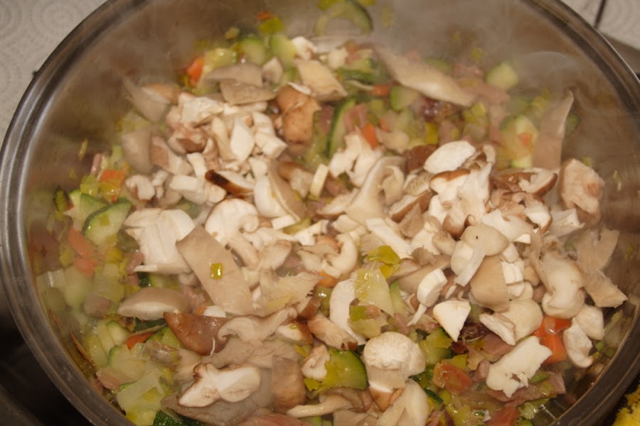Incorporamos el jamón, que no se haga mucho porque queda seco, removemos y echamos el calabacin. Rehogamos hasta que veamos que esta blando, añadimos las setas, sazonamos, teniendo en cuenta que el jamón lleva sal, damos unas vueltas al guiso, unos 7 minutos. Aunque no quede bien hecho, no importa, en el horno termina de hacerse.