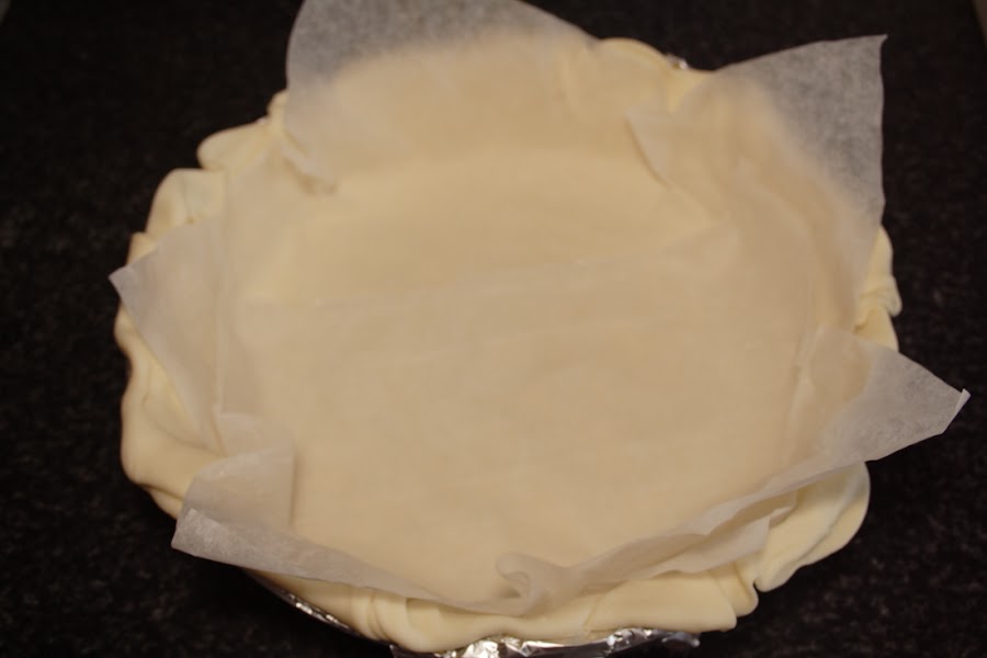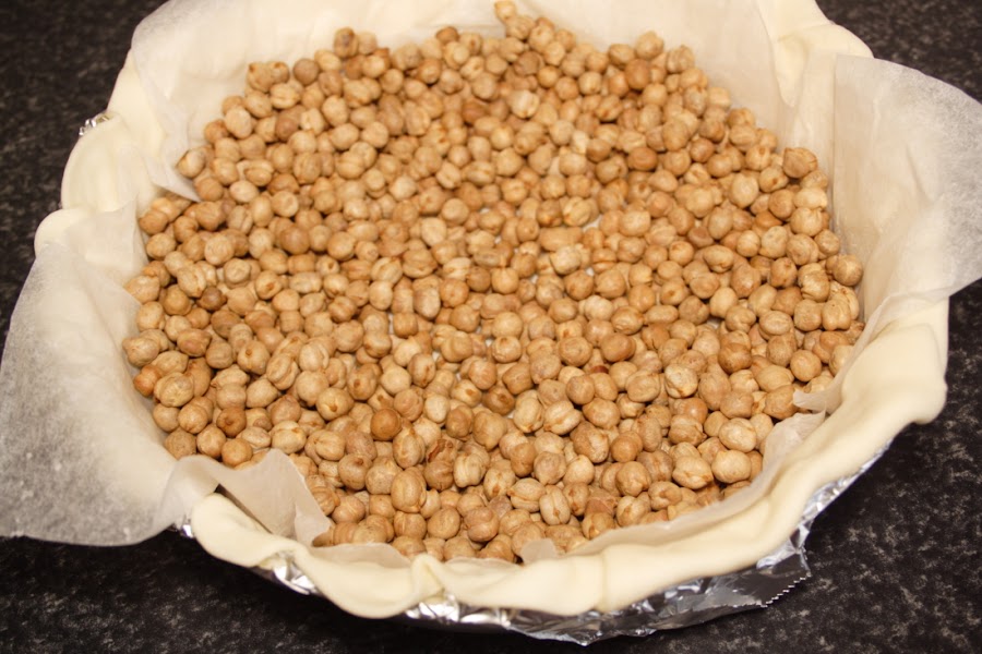 Forramos un molde desmoldable con la pasta brisa, colocamos encima el papel que trae y vertemos unos garbanzos para que la masa no suba (tengo ya unos para estos menesteres, siempre los mismos). Horneamos a 190ºC, calor arriba y abajo, colocando el recipiente de la parte media del horno hacia abajo, para que la masa se nos dore por la parte inferior, durante 12-15 minutos.