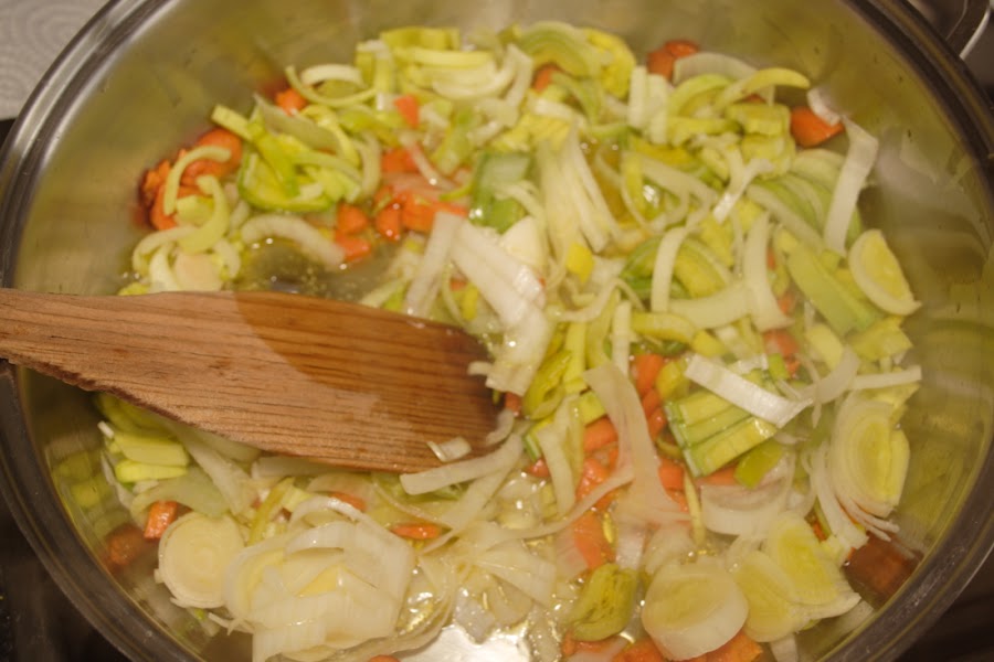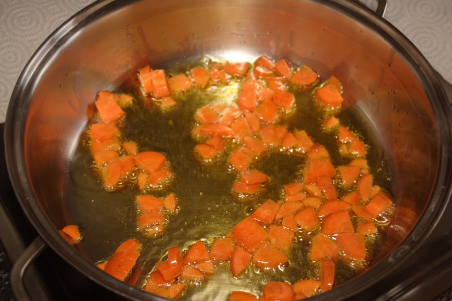 En una olla baja y ancha vertemos un chorro de aceite de oliva, echamos la zanahoria y esperamos a que se dore un poco, seguimos con el puerro picado, removemos, que se vaya pochando.