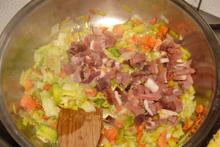 Mientras: Troceamos el jamón, limpiamos y troceamos las verduras por separado, y las setas. Reservamos.