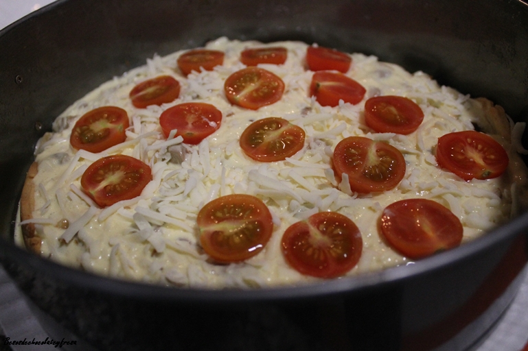 Disponemos dicha masa por encima de la masa que teníamos en el horno. Colomos por encima los tomates cherry por la mitad y espolvoreamos de nuevo queso rallado al gusto.