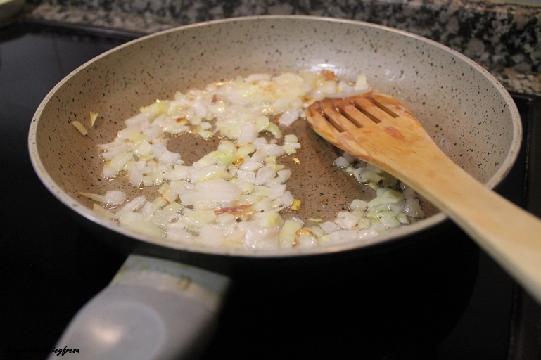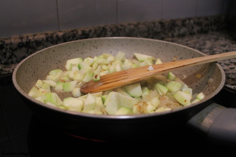 Cortamos la cebolla en trocitos pequeños y rehogamos lentamente sin que se queme. A continuación en trozo también pequeños añadimos el calabacín (en este caso sin pela, ya sabéis que yo para el puré me gusta con pela por la vitamina que tiene).