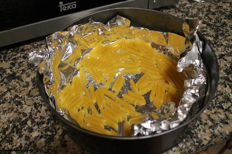 Previamente precalentamos el horno a 180º y forramos un molde con la masa brisa y pichamos con un tenededor. TRUCO: conviene ponerle peso encima para que no se nos hinche y para ello colocamos papel albal o de hornear y encima unos cuantos macarrones o garbanzos. Dejar hacer unos 10 minutos más o menos.