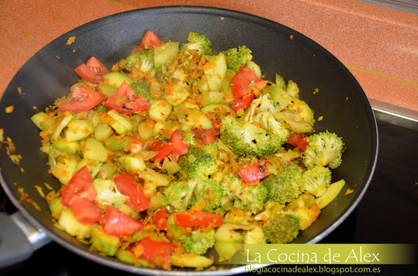 Ponemos a sofreir la verdura en una sarten con un poco de aceite, en el orden que siempre utilizamos, primero el puerro, luego la zanahoria, el calabacín, el brócoli y por ultimo el tomate, sal-pimentamos y cocinamos todo junto dejando las verduras al dentes.
