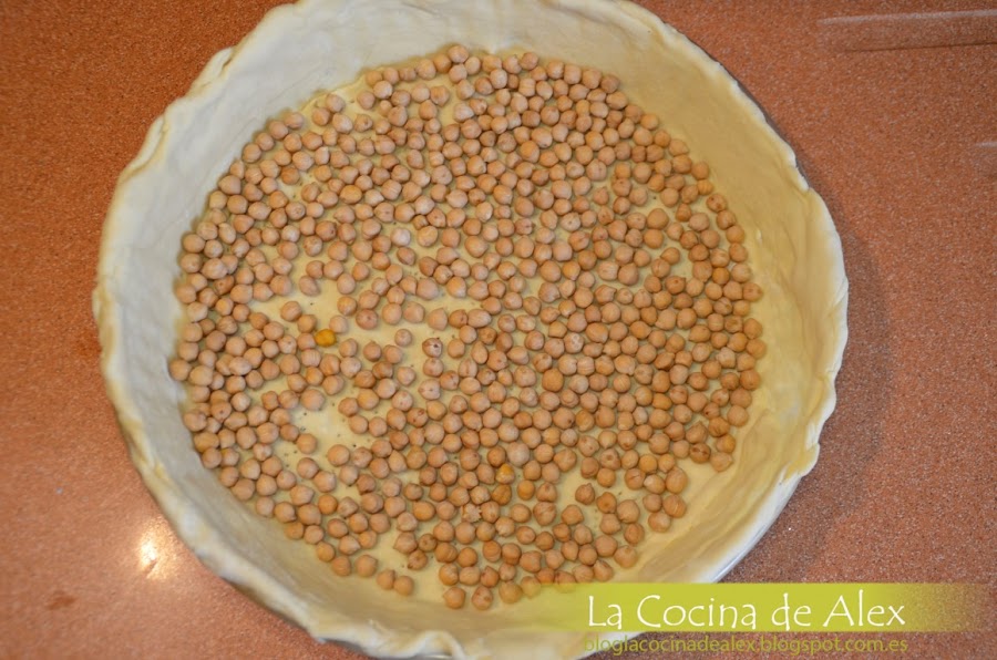 PREPARACIÓN:En primer lugar lo que hacemos es preparar la base de nuestro pastel, colocamos el hojaldre en el molde donde vamos a presentar el pastel y pinchamos la base con un tenedor para que no suba. Si queréis para ayudar que no suba yo le pongo en la base garbanzos, estos garbanzos una vez se hornea no se pueden usar para comer pero yo los guardo en una bolsa una vez están fríos y los utilizo siempre que quiero que no suban las masas.