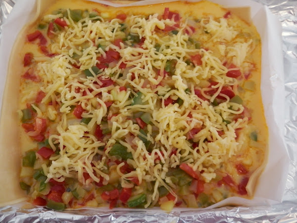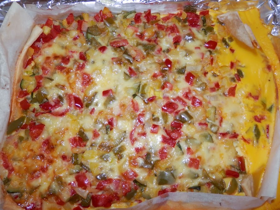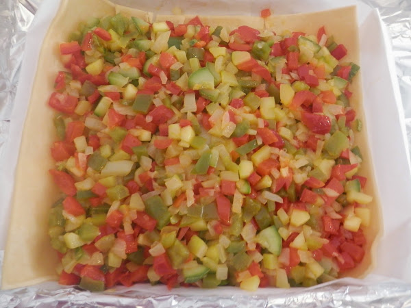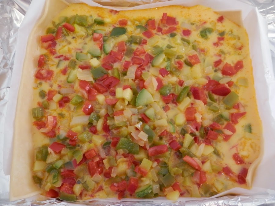 En una placa de horno pondremos la masa y encima de ésta, la mezcla anterior.
