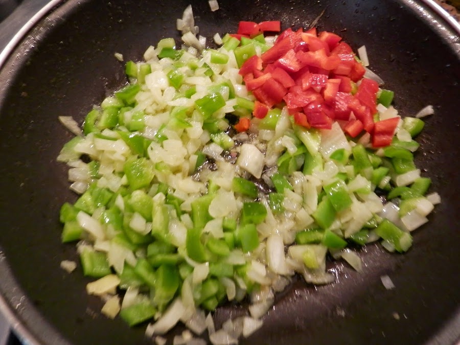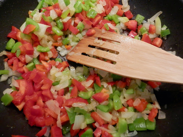 Picamos en cuadraditos pequeños los pimientos y la cebolla.