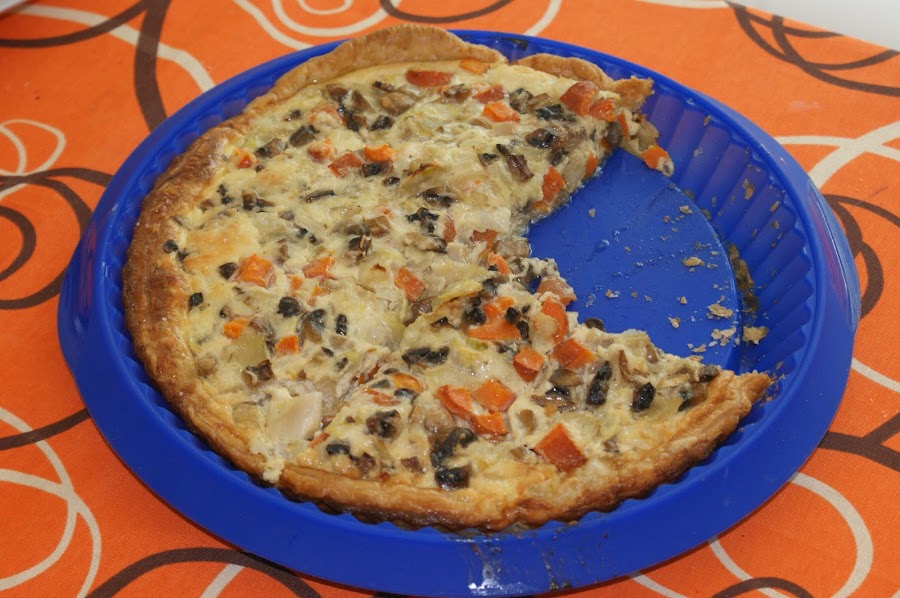 Picamos las verduras y las ponemos en la sartén con un poquito de aceite. Las freímos un poco y salpimentamos, en una fuente batimos los huevos y añadimos la nata (crema de leche), lo mezclamos y se lo echamos a las verduras mezclamos y añadimos por encima a la masa.