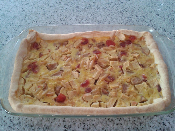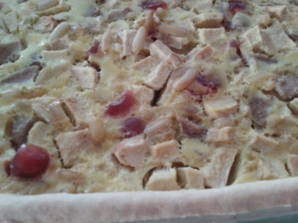 Sobre la masa pondremos todas las frutas y por encima el batido de huevo y nata (crema de leche).